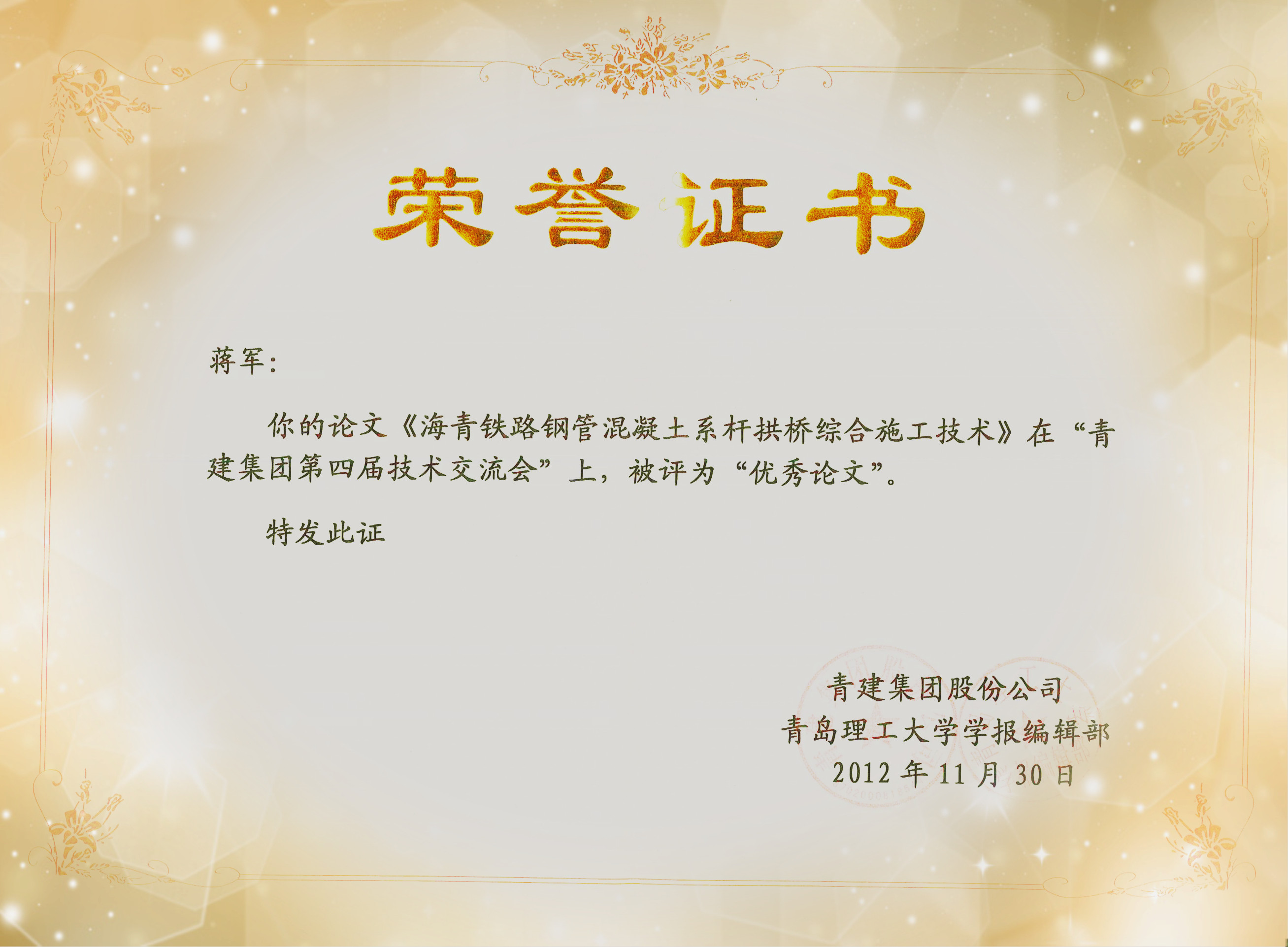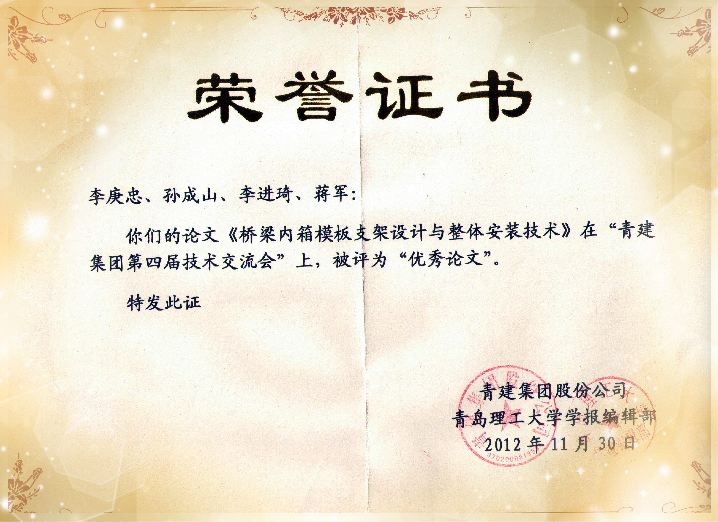 本次交流會(huì)議是繼青建集團(tuán)首屆(2006)、第二屆(2008)、第三屆(2010)技術(shù)交流會(huì)成功舉辦之后的又一次技術(shù)盛會(huì),以“交流、創(chuàng)新、合作、共贏”為宗旨,在校企雙方共同交流的基礎(chǔ)上,聘請(qǐng)國(guó)內(nèi)知名專家進(jìn)行專題講座,為廣大科技人員奉獻(xiàn)了一場(chǎng)知識(shí)盛宴。本次參會(huì)的論文主要是結(jié)合近年來(lái)集團(tuán)各公司及成員單位項(xiàng)目施工過(guò)程中的重點(diǎn)、難點(diǎn)技術(shù)總結(jié)完成。共收集論文77篇,評(píng)選出優(yōu)秀論文26篇。我公司共提交論文7篇,其中《海青鐵路鋼管混凝土系桿拱橋綜合施工技術(shù)》(作者:蔣軍)、《橋梁內(nèi)箱模板支架設(shè)計(jì)與整體安裝技術(shù)》(作者:李庚忠)獲得優(yōu)秀論文,蔣軍代表公司在會(huì)上作了交流匯報(bào),優(yōu)秀論文作者獲得了集團(tuán)股份公司與青島理工大學(xué)??庉嫴柯?lián)合頒發(fā)的榮譽(yù)證書,含優(yōu)秀論文在內(nèi)的5篇論文將在《青島理工大學(xué)學(xué)報(bào)》上公開(kāi)發(fā)表。