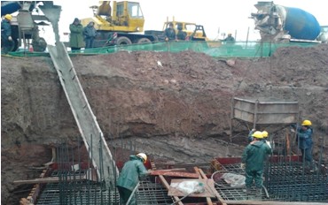 松旺莊分離立交工程是龍青高速公路一標(biāo)的關(guān)鍵控制性工程,左幅7#承臺(tái)則是松旺莊分離立交四個(gè)臨邊主墩基礎(chǔ)之一。由于前期設(shè)計(jì)單位地質(zhì)勘測(cè)有誤,承臺(tái)基坑被大范圍巖層覆蓋,基坑開挖難度極大。針對(duì)此問題,項(xiàng)目部召開緊急會(huì)議,經(jīng)過商討和分析,采用挖掘機(jī)、使用破碎錘破除巖層,合理安排工序,順利地完成了基坑開挖工作。此次混凝土澆筑作業(yè)考慮到承臺(tái)臨近公路,為盡量降低對(duì)交通的影響,采用溜槽和吊斗吊裝兩種施工工藝同時(shí)進(jìn)行,既縮短了混凝土澆筑時(shí)間,也節(jié)省了吊車等施工機(jī)械的使用費(fèi)用,順利而高效地完成了此次承臺(tái)混凝土澆筑作業(yè)。