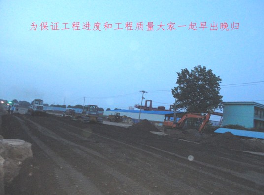 自6.21日起,柳州路(揚(yáng)州路~蘭州路)開始進(jìn)行水泥穩(wěn)定砂礫土底基層攤鋪工作。項(xiàng)目部結(jié)合現(xiàn)場(chǎng)狀況及車輛運(yùn)輸?shù)缆?,首先從寺門首路路口開始向揚(yáng)州路方向施工,鋪裝到揚(yáng)州路路口之后,再?gòu)乃麻T首路路口向蘭州路方向施工。鏖戰(zhàn)一朝拉開,時(shí)間就是效益。在整個(gè)施工過程中,項(xiàng)目部全體員工,頂著烈日酷暑,奮戰(zhàn)在施工第一線。每天早上五、六點(diǎn)到工地,中午輪流用餐,一直工作到晚上九、十點(diǎn)鐘,每天工作時(shí)間都超過12小時(shí)。經(jīng)過十天的努力工作,在6月30日暴雨來臨前完成了全線水泥穩(wěn)定砂礫土底基層的鋪裝,共約58000m2,確保了工程后續(xù)工序在汛期的正常施工進(jìn)度。