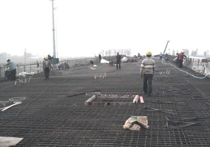國慶期間,萊西項目部施工現(xiàn)場一片忙碌景象,工作人員按照原施工計劃,齊心協(xié)力,日夜奮戰(zhàn),分秒必爭,切實組織現(xiàn)場施工生產(chǎn)。節(jié)日期間,項目部積極調動人力資源,盡可能提早完成主跨混凝土澆筑計劃。工地現(xiàn)場,木工、鋼筋工、電焊工等都在各自的工作面上緊張有序作業(yè),現(xiàn)場技術人員有的根據(jù)施工需要組織工人作業(yè),有的就鋼筋模板施工過程中容易出現(xiàn)的問題進行現(xiàn)場技術交底,有的則進行測量放線,為后續(xù)施工及工作面開展添油加碼。