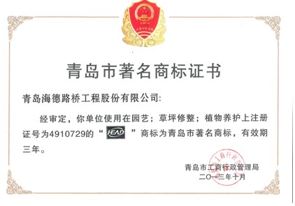 近日,由青島市工商局發(fā)文公示,根據(jù)《青島市著名商標(biāo)認(rèn)定和保護(hù)辦法》及有關(guān)規(guī)定,本單位使用在園藝、草坪修整、植物養(yǎng)護(hù)上注冊(cè)證號(hào)為4910729的“