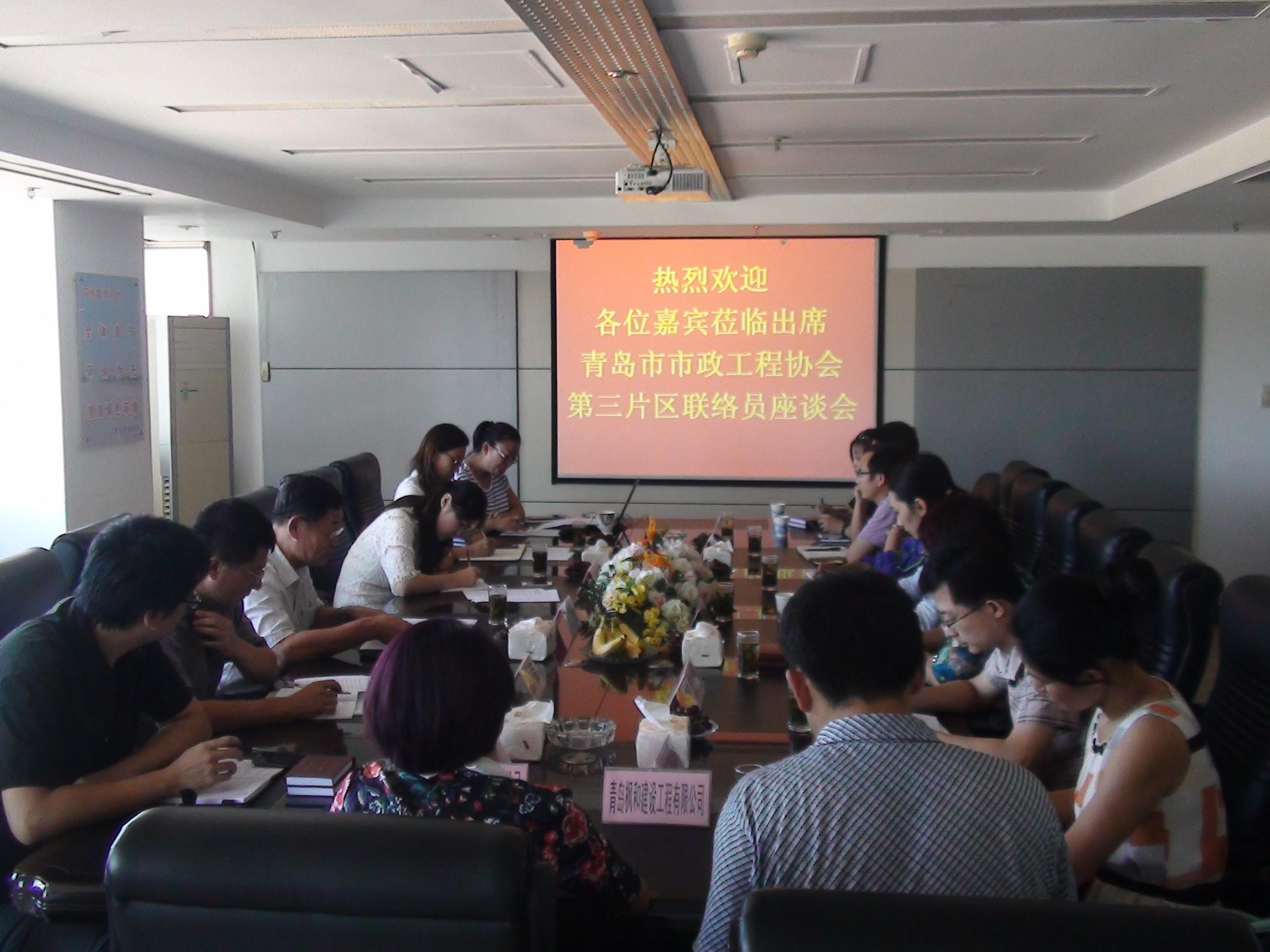 2014年9月4日下午14點(diǎn),由青島市市政工程協(xié)會發(fā)起組織、我單位主辦的協(xié)會第三片區(qū)首次聯(lián)絡(luò)員座談會在我公司會議室召開。青島市市政工程協(xié)會副會長王國良、秘書處副秘書長張青、三片區(qū)組長單位青島海德路橋工程股份有限公司執(zhí)行總裁寇媛媛出席了本次座談會,參加此次會議的還有片區(qū)副組長單位青島市益水工程股份有限公司、青島市政監(jiān)理咨詢有限公司、萊西市市政管理處以及片區(qū)其他會員單位的聯(lián)絡(luò)員,共計(jì)15家單位。