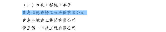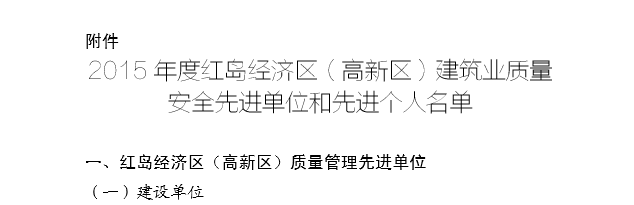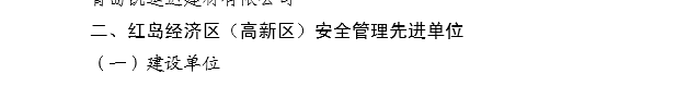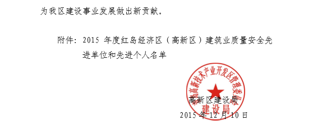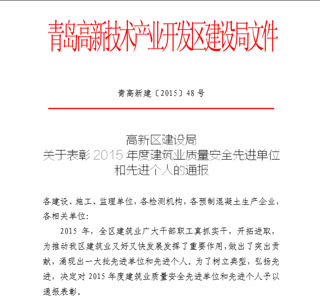 2015年12月,青島高新技術(shù)產(chǎn)業(yè)開發(fā)區(qū)建設(shè)局下發(fā)《青高新建【2015】48號》文件,表彰2015年度紅島經(jīng)濟區(qū)(高新區(qū))建筑業(yè)質(zhì)量安全先進單位和先進個人。公司作為參與高新區(qū)市政工程建設(shè)的施工單位,榮獲“質(zhì)量安全先進單位”的殊榮,一分公司程顯光和鄒曉杰分別獲得“質(zhì)量管理先進個人”和“安全管理先進個人”的光榮稱號。