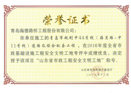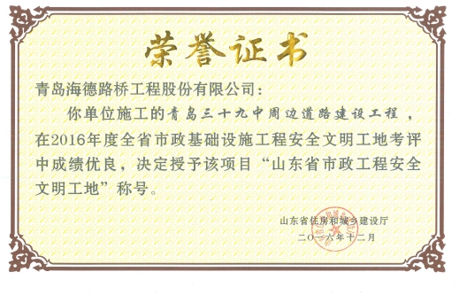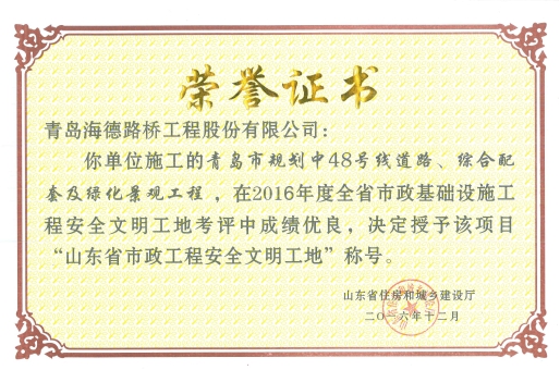 近日,山東省市政工程安全文明工地榮譽(yù)證書已下發(fā),由我分公司施工的“青島三十九中周邊道路建設(shè)工程”、“青島市規(guī)劃中48號(hào)線道路綜合配套及綠化景觀工程”、“青島市規(guī)劃中44號(hào)線道路及配套工程”三個(gè)項(xiàng)目通過驗(yàn)收專家組的重重考評終脫穎而出獲此榮譽(yù)。