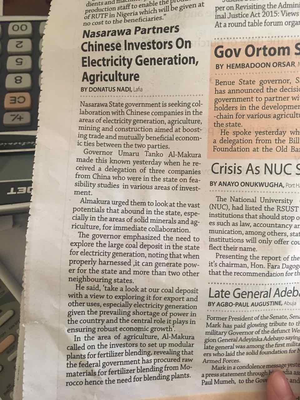 2017年3月9日,在尼日利亞納薩拉瓦(NASARAWA )州的州政府,總裁鞏光磊一行拜訪了州長、州政府內(nèi)閣全體成員。州長Al-Makura贈送給總裁鞏光磊“友誼金牌”以作紀念。尼日利亞國家主流媒體、納薩拉瓦州官方媒體均做此次訪問相關報道。