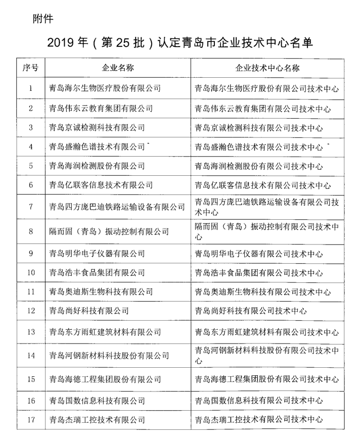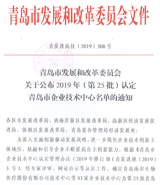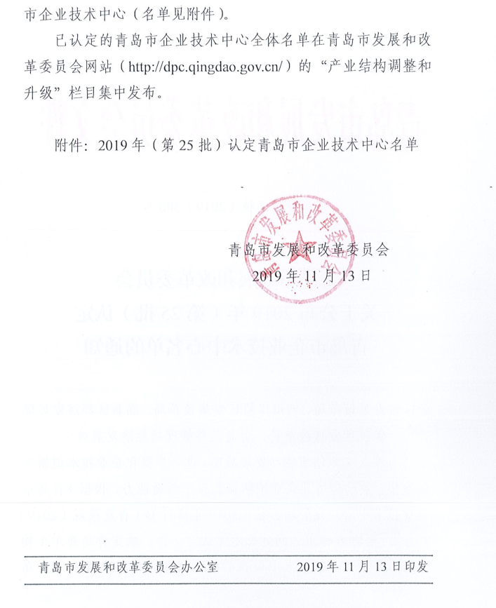 2019年11月13日,青島市發(fā)展和改革委員會正式發(fā)文《關(guān)于公布2019年(第25批)認定青島市企業(yè)技術(shù)中心名單的通知》(青發(fā)改高技[2019]308號),我公司企業(yè)技術(shù)中心通過了青島市認定。