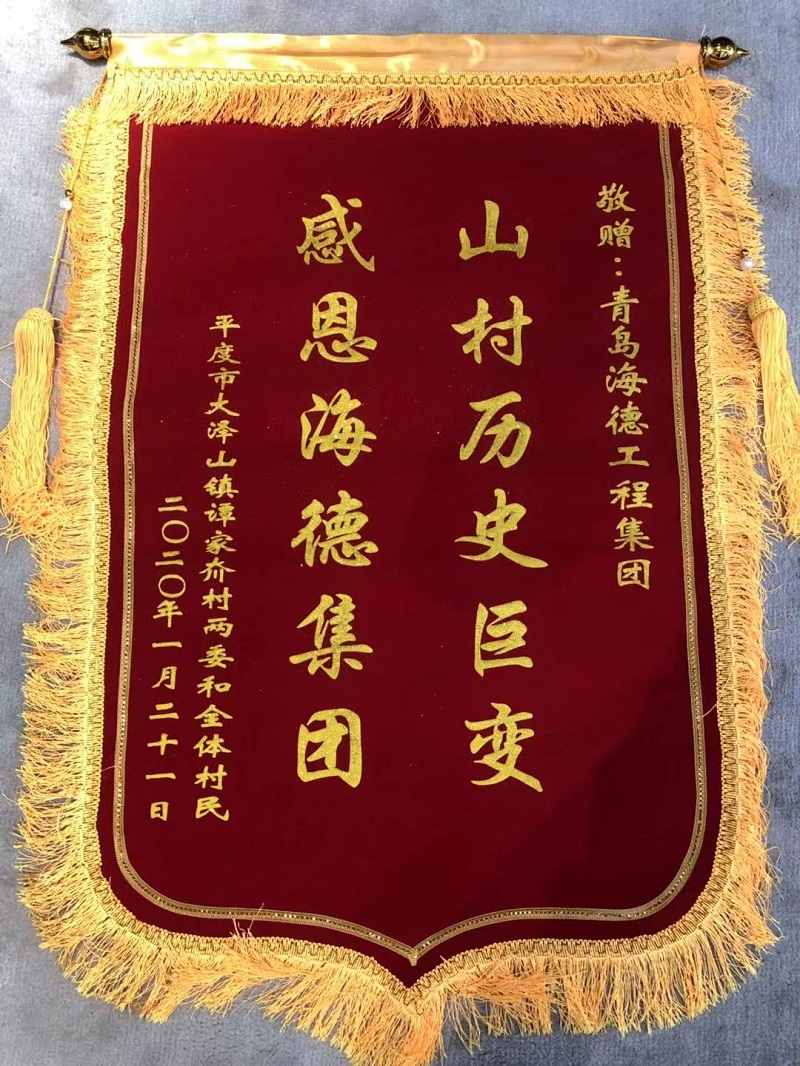 集團(tuán)董事長鞏光磊對于孫夕臣書記一行的到來表示熱烈歡迎。孫書記表示此行的目的是為了代表平度市大澤山鎮(zhèn)譚家夼村兩委和全體村民對于海德集團(tuán)為譚家夼村修筑兩條扶貧路表示衷心感謝。會上,孫夕臣書記向我集團(tuán)贈送“山村歷史巨變,感恩海德集團(tuán)”的錦旗,并祝愿海德集團(tuán)蒸蒸日上,越來越好。