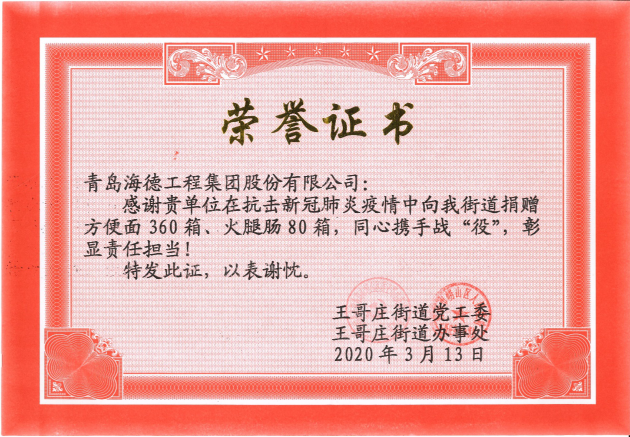集團董事長鞏光磊在得知王哥莊街道社區(qū)防控一線人員加班加點為周邊居民做好防控吃飯不便的情況下,迅速采購物資,為王哥莊街道送去360箱方便面、80箱火腿腸作為后勤保障。集團一直熱心公益事業(yè),自新型冠狀病毒感染肺炎疫情發(fā)生后,集團、各分支機構(gòu)及所有員工都伸出援助之手抗擊疫情,已向嶗山區(qū)紅十字會、嶗山區(qū)沙子口街道、膠州區(qū)李哥莊、王哥莊街道等多地捐款捐物,攜手戰(zhàn)“疫”彰顯海德責任擔當。