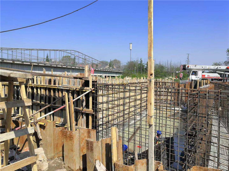 環(huán)灣路-長(zhǎng)沙路立交橋工程現(xiàn)場(chǎng)施工人員進(jìn)行首根墩柱澆筑