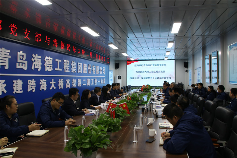 2022年12月5日下午,青島海德工程集團(tuán)跨海大橋二期工程臨時(shí)黨支部與招商銀行青島分行營(yíng)業(yè)部黨支部在海德集團(tuán)跨海大橋高架路二期工程項(xiàng)目部會(huì)議室聯(lián)合開(kāi)展“黨建共建”、“學(xué)習(xí)貫徹黨的二十大精神”主題黨日活動(dòng)。黨的二十大代表、招商銀行青島嶗山支行大堂主管王瑾敏,嶗山區(qū)工信局機(jī)關(guān)黨委副書(shū)記董元波,招商銀行青島分行黨委委員、副行長(zhǎng)侯登峰,營(yíng)業(yè)部黨支部書(shū)記柳宏,海德集團(tuán)黨總支書(shū)記、董事長(zhǎng)鞏光磊,黨總支副書(shū)記、副總裁呂同占,大橋項(xiàng)目部臨時(shí)黨支部書(shū)記孫成山,黨支部全體黨員、預(yù)備黨員、入黨積極分子等共同參加了此次活動(dòng)。海德集團(tuán)黨總支副書(shū)記、副總裁呂同占主持活動(dòng)。