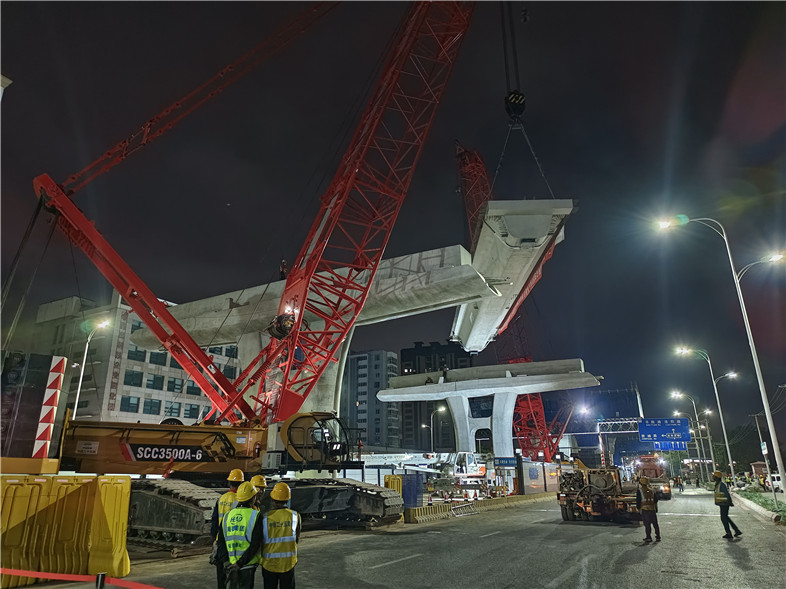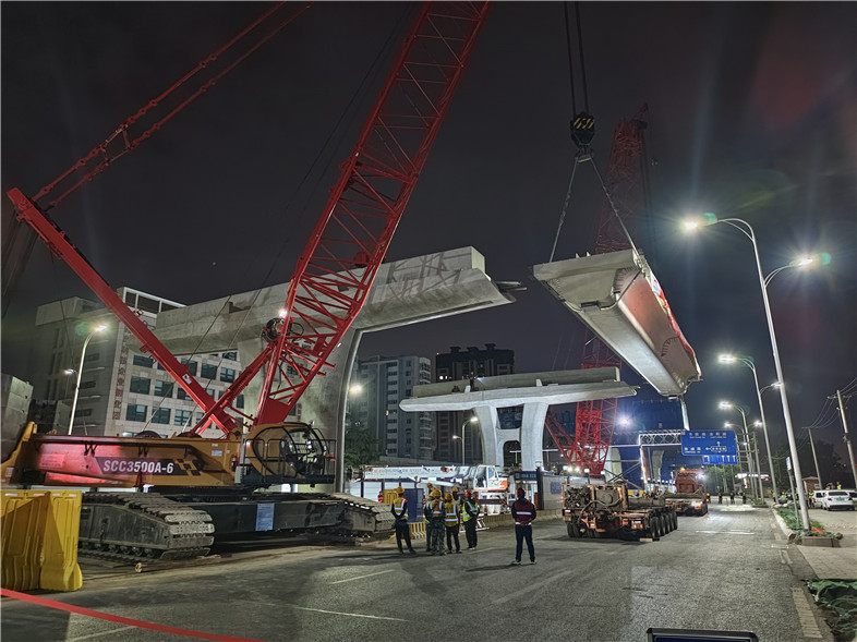 現(xiàn)場采用兩臺350噸履帶吊“雙機抬吊”方式架設,于26日晚22:58啟動架設,27日凌晨0:16完成首榀箱梁架設,凌晨3:38完成整跨箱梁架設。為確保吊裝工作安全有序進行,參建各方高度重視,多次召開箱梁運輸?shù)跹b專題會,施工前制定了嚴密的施工方案及應急預案,并通過專家論證。在集團各部門緊密配合下,箱梁架設現(xiàn)場人員分工明確、過程把控到位,確保了箱梁架設工作安全順利進行。