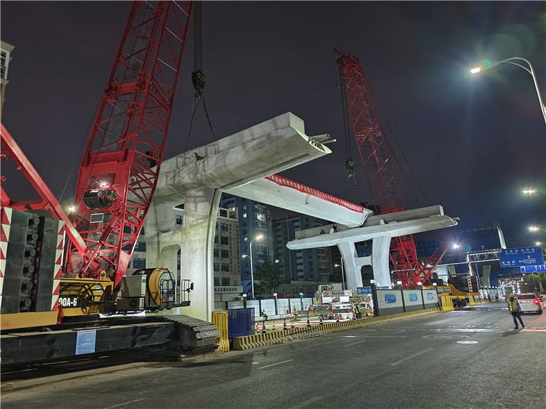 2023年5月27日凌晨,隨著最后一榀箱梁被精確地吊放在指定位置,重慶路快速路項目首跨預制箱梁順利架設完成,標志著重慶路快速路橋梁主體正式進入上部結構施工階段,距年底主線貫通節(jié)點又邁進了關鍵一步。