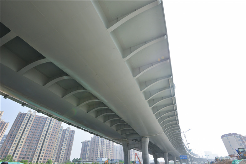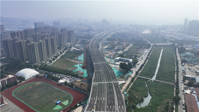 跨海大橋高架路是東岸城區(qū)“四縱五橫”快速路網(wǎng)中的第三橫,既是承接膠州灣大橋交通銜接功能的門戶通道,也是貫通東西,實(shí)現(xiàn)區(qū)域互通互聯(lián)的市區(qū)東西向主動(dòng)脈??绾4髽蚋呒苈范诠こ讨骶€西接現(xiàn)狀海爾路立交,跨越深圳路后,東側(cè)采用互通立交與青銀高速聯(lián)系,全長1.6km。高架路二期與青銀高速近期先實(shí)施北向西、西向北、西向南3條匝道。