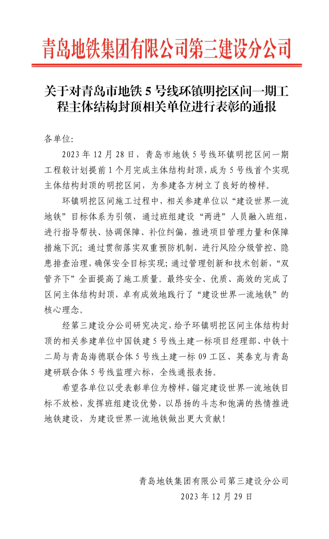 2023年12月28日,由集團公司承建的地鐵5號線環(huán)鎮(zhèn)明挖區(qū)間項目主體結(jié)構(gòu)順利封頂,標志著地鐵5號線唯一一座明挖區(qū)間完成重要里程碑節(jié)點,地鐵集團特此發(fā)來表彰,對集團公司承建工作表示了肯定,為參建各方樹立了良好的榜樣。