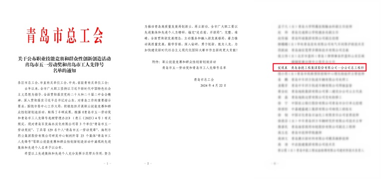 集團(tuán)一分公司總工程師侯現(xiàn)真榮獲“青島市五一勞動(dòng)獎(jiǎng)?wù)隆?/span>