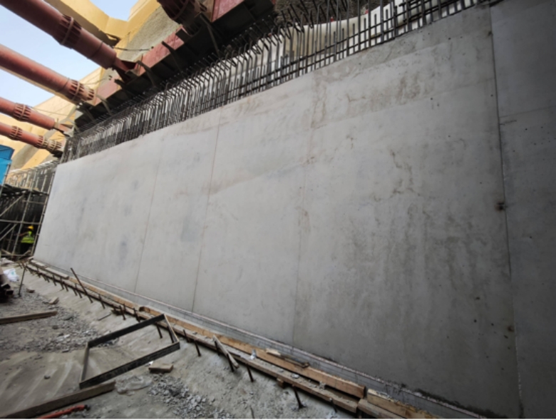 為達到優(yōu)質目標,項目部成立專項小組在主體結構施工施工前策劃飾面高性能混凝土施工措施,施工過程項目管理專項小組全程參與,施工前進行交底、全流程監(jiān)督、拆模后總結復盤,最終交出10塊側墻初驗評價A級9塊、B級1塊合格率90%的成績。