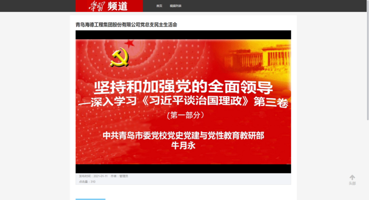2021年1月12日,集團(tuán)公司組織全體黨員開展學(xué)習(xí)《習(xí)近平談治國(guó)理政》(第三卷)和民主生活會(huì)活動(dòng),通過“學(xué)習(xí)強(qiáng)國(guó)”的“學(xué)習(xí)頻道”網(wǎng)絡(luò)直播形式,收聽了中共青島市委黨校牛月永教授的《堅(jiān)持和加強(qiáng)黨的全面領(lǐng)導(dǎo)》網(wǎng)絡(luò)黨課。